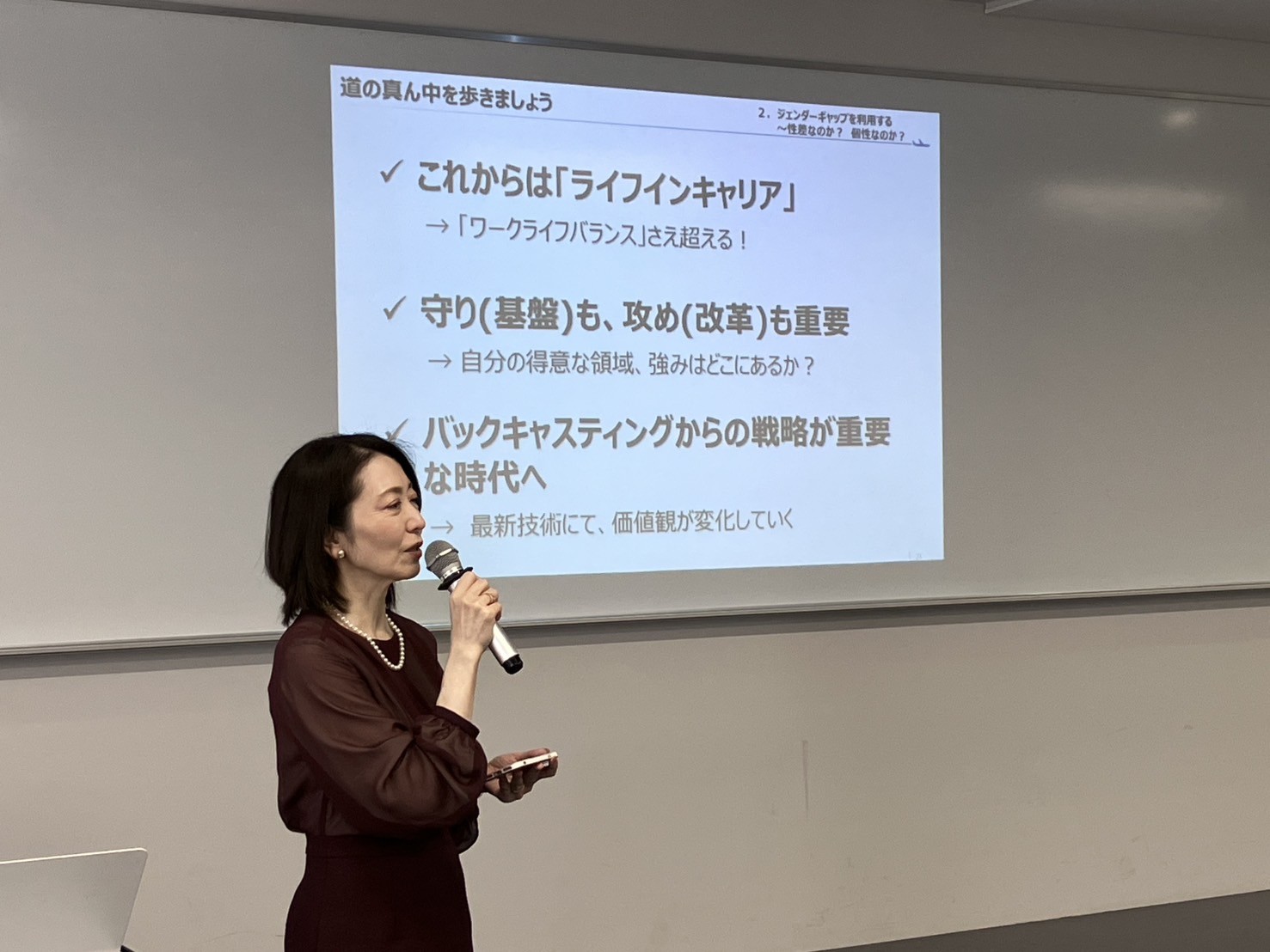 この講義は、同大学の岡島 眞理教授が主催するもので、ホスピタリティ企業戦略におけるジェンダー戦略の重要性を学生に伝えることを目的としています。今回は、過去の日本企業におけるジェンダーギャップの事例、現代の企業が直面する課題とその解決策について取り上げられました。