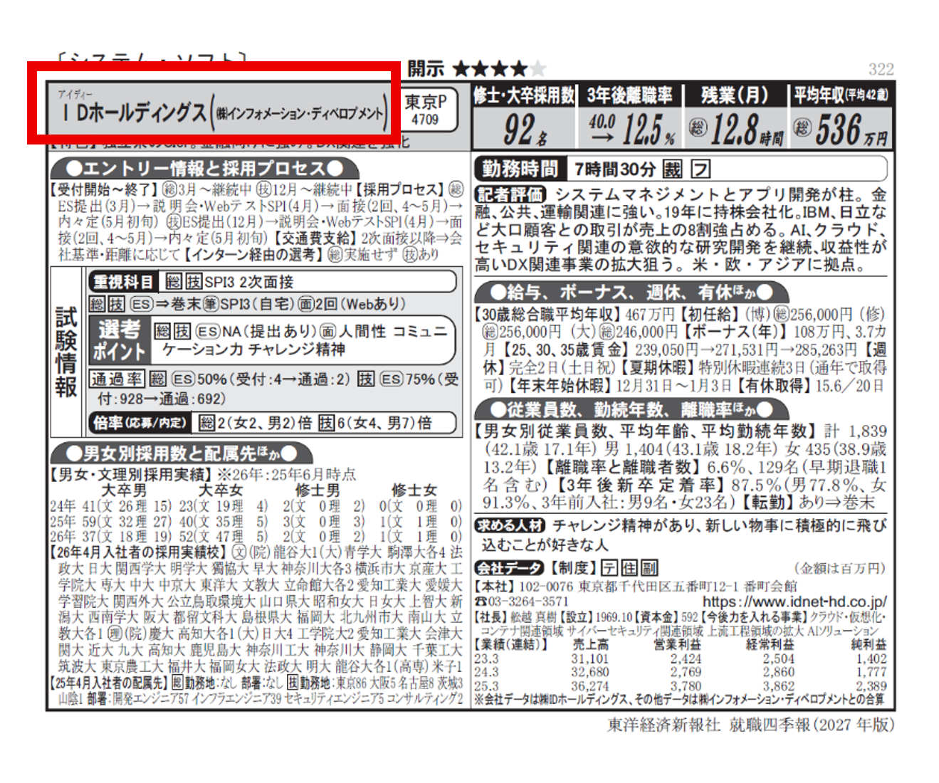 就職四季報に記載の(株)IDデータセンターマネジメント、(株)DXコンサルティングは、2025年4月1日に当社の連結子会社である株式会社インフォメーション・ディベロプメントを存続会社とした吸収合併を実施し、すでに解散しております。